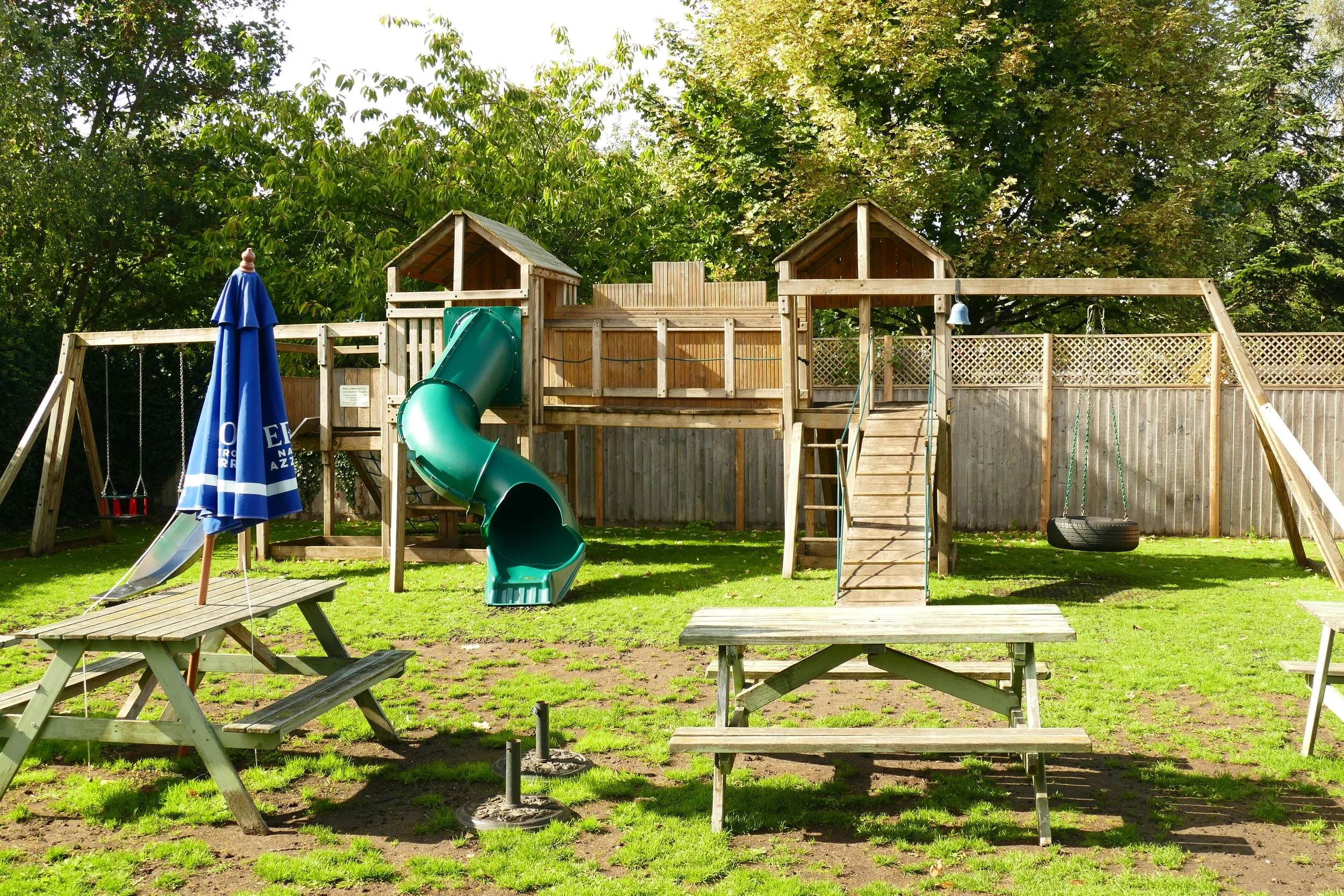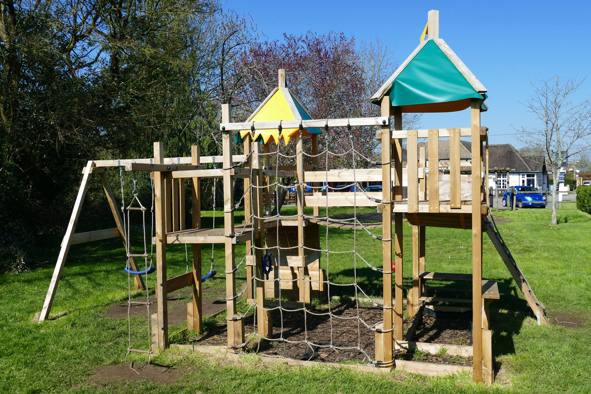 The pub is The High Corner Inn with a large garden and a substantial wooden play structure.