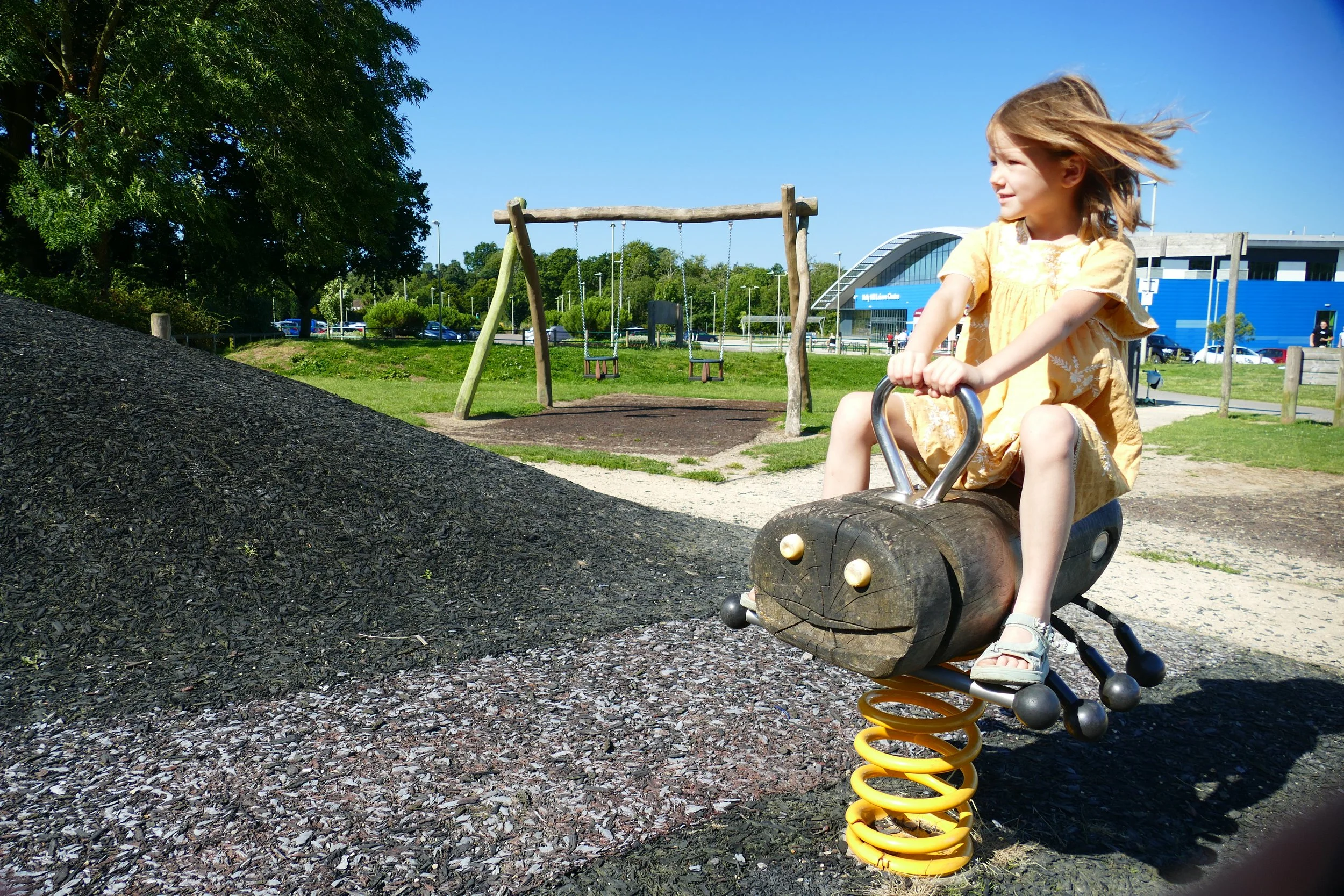 Follow the footprints around the lake to find the dinosaur island play area. Along the way you will also see a cafe and a paddling beach.
