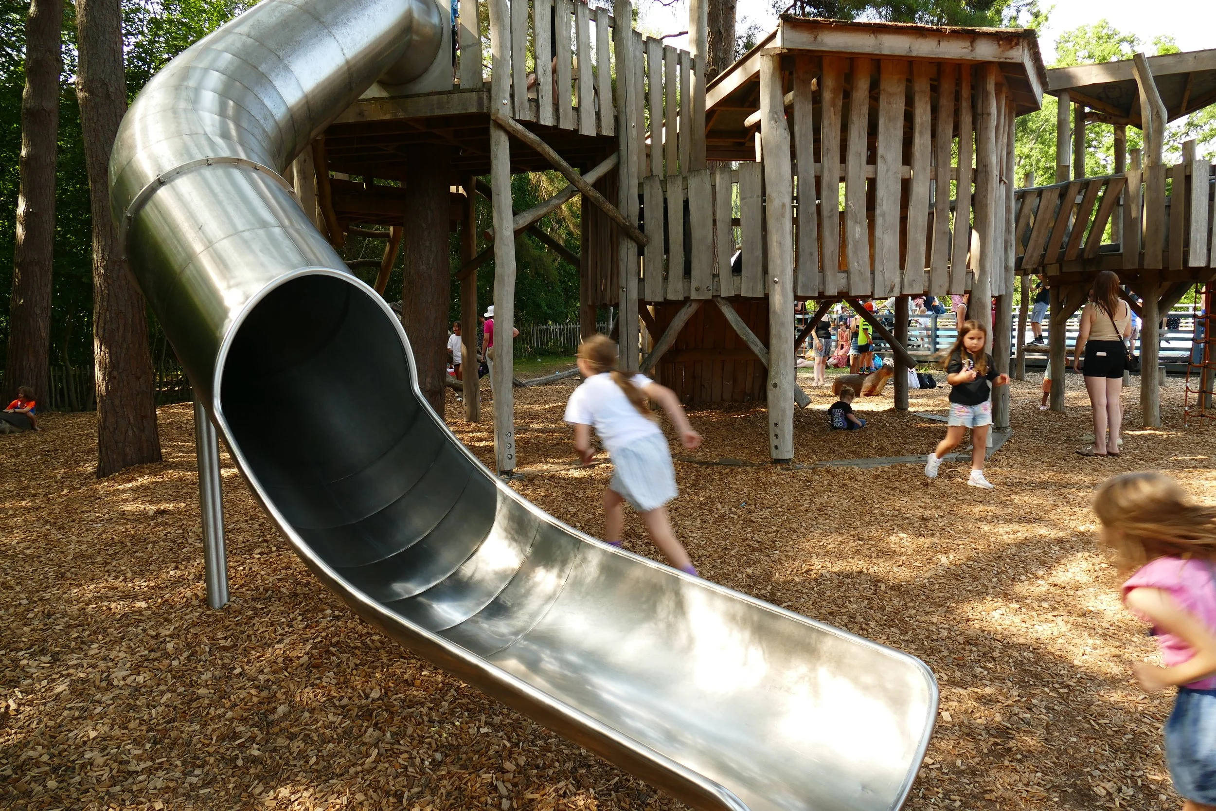 A very short walk through this park passes a play area, a wild-wood play area, a scooter track and a café.