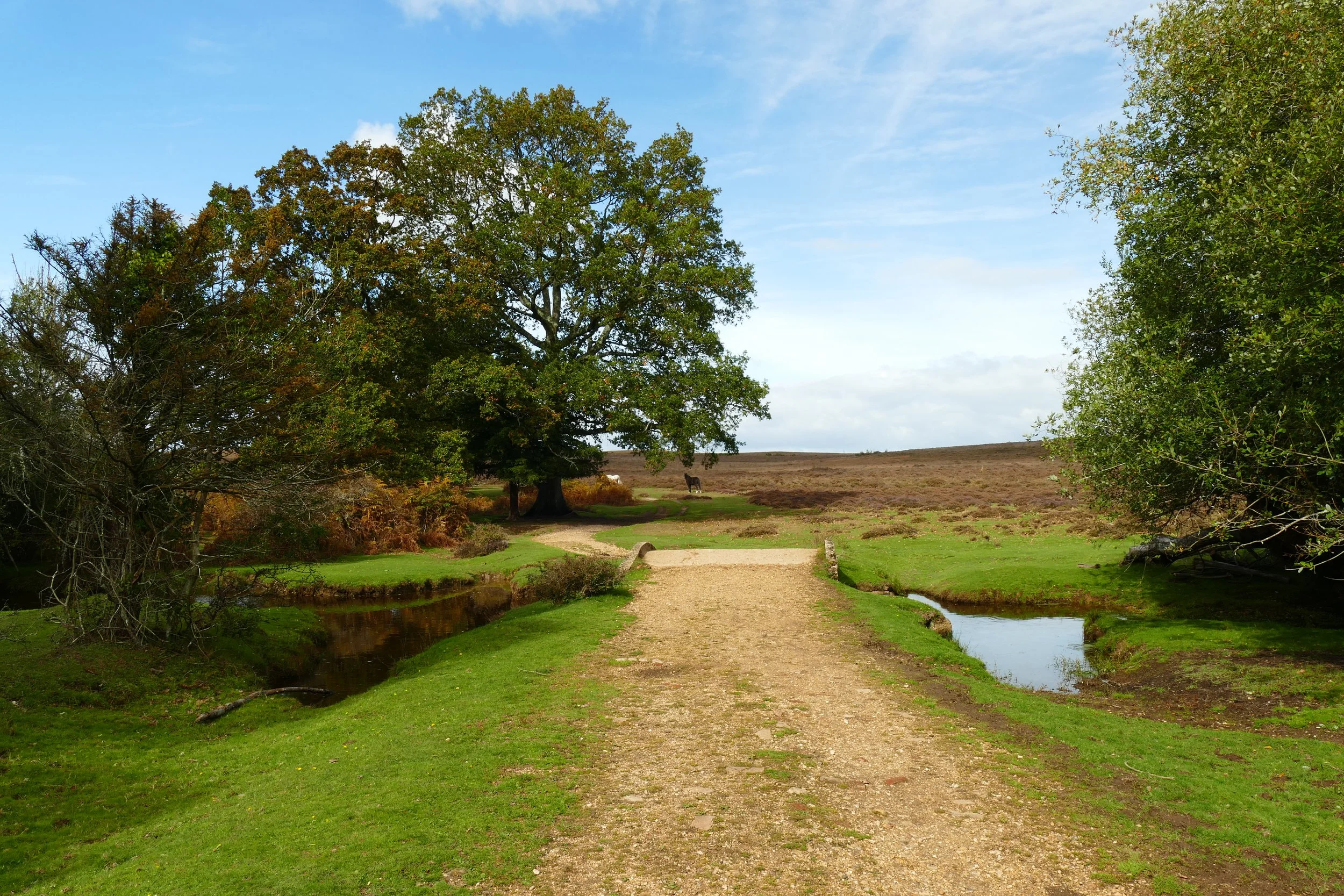 Cross the entrance track to Broomy Lodge and continue in the same direction. Immediately before you cross a ford at the bottom of a dip (the stream is dry at the time of writing, but the plethora of stones will make the spot recognisable), turn left onto a minor path, heading in the opposite direction of the gate. After a few metres cross another ford (also dried up and just distinguishable by the stones).
