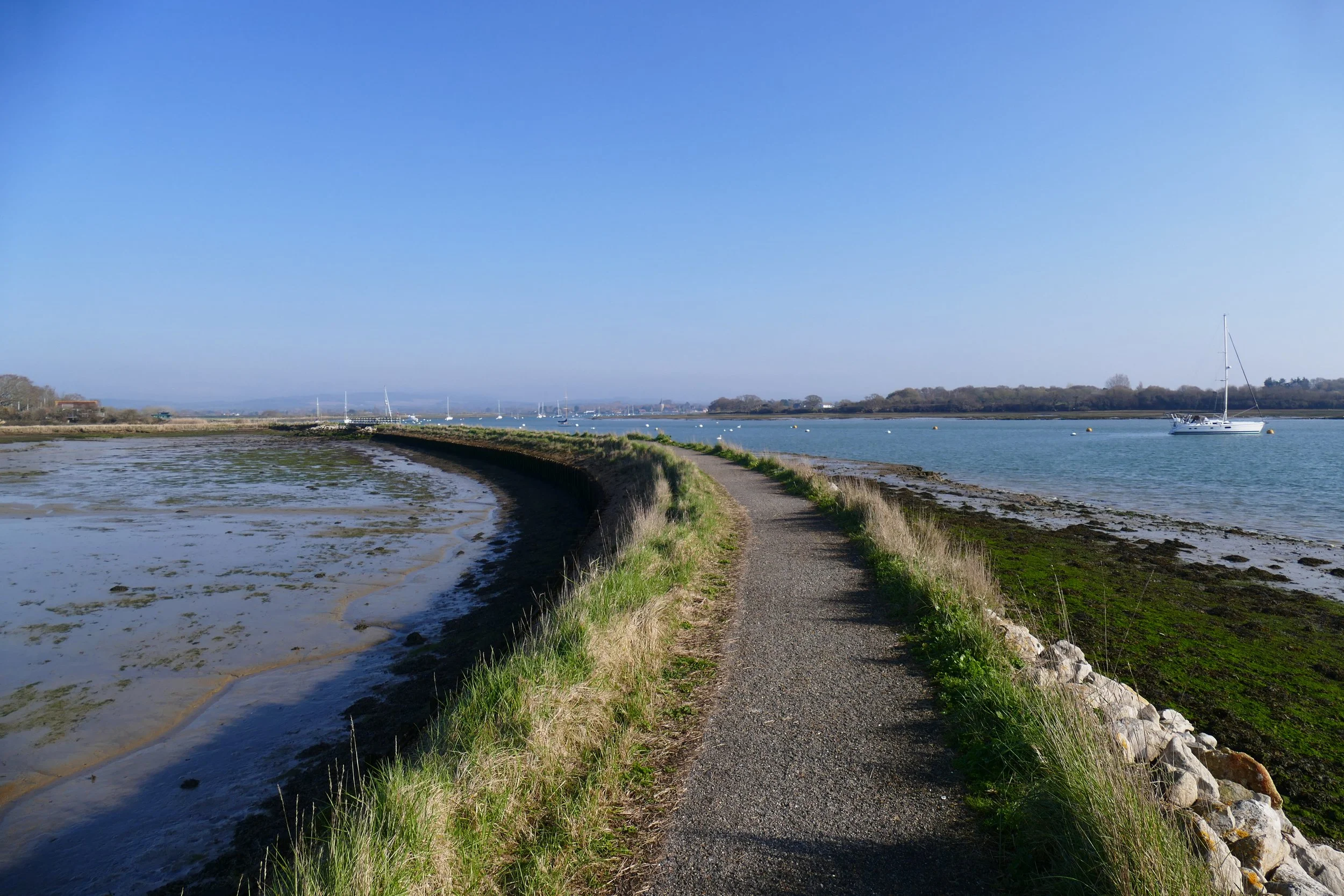 Turn right at the water and continue on the coastal path. Bosham Channel begins to widen as it makes its way closer to the sea and you will walk over a series of two wooden bridges with tidal pools/mudflats to your right. Look out for a bench with a view at Cobnor Point at the end of the peninsula.