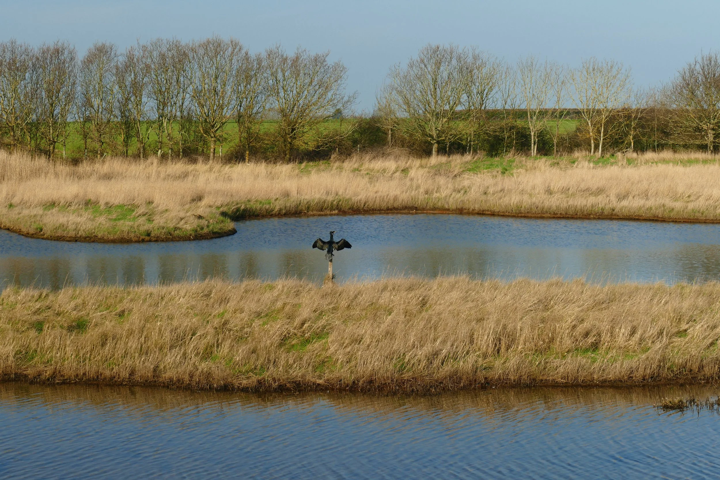 Take the steps out of the car park turn, then immediately turn left and follow the straight path along the edge of a field to the water’s edge. Turn right and walk with the water to your left.