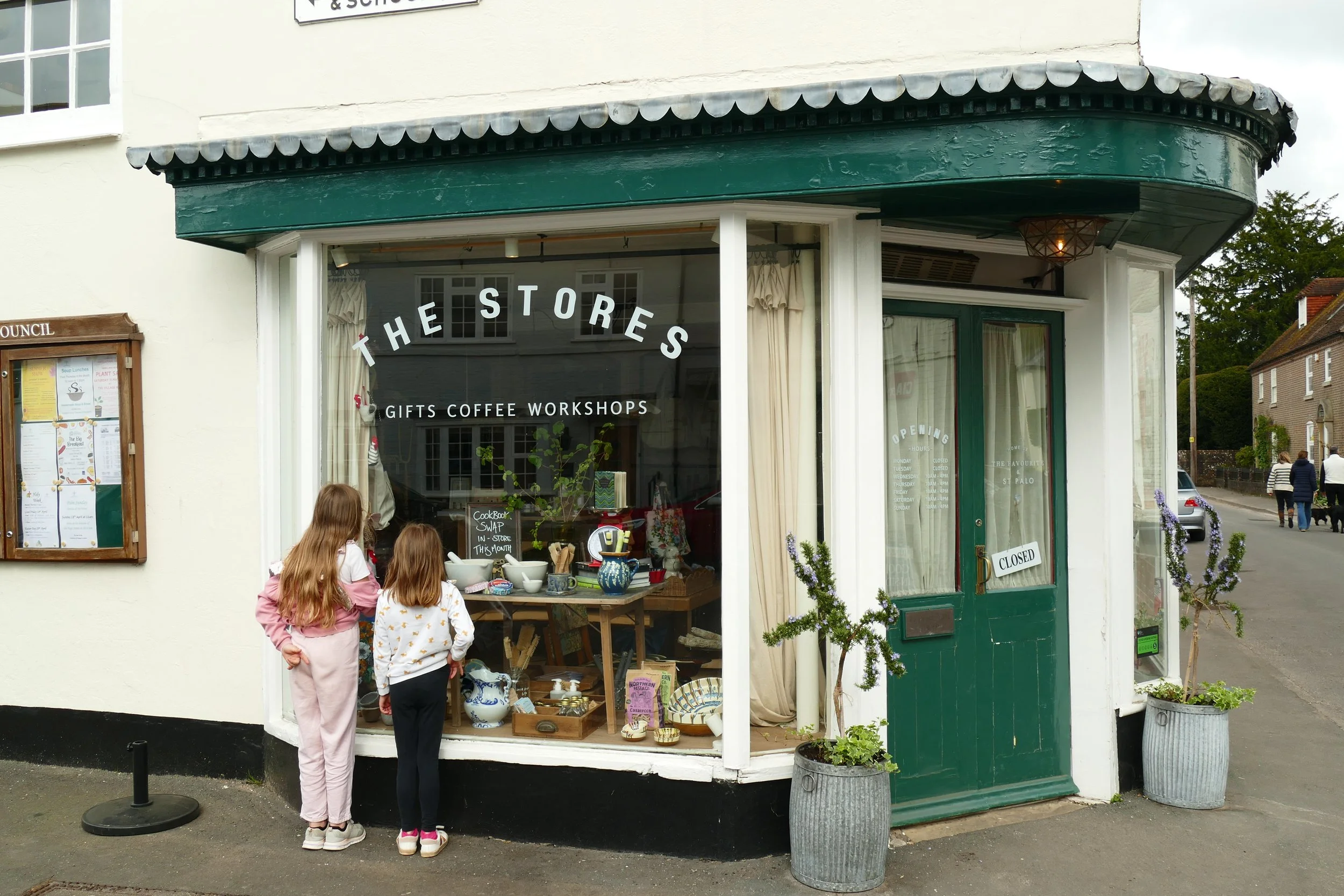Go through the metal gate on your left when you reach the wall of the churchyard and cross a little parking area. The wall to the church will be on your right. At the graveyard, turn right to walk past the church and into the village with one of my favourite views in Hambledon. Turn right at the main street for The Vine Pub and the play area beside the village hall. The Stores is on the left corner, which sells lifestyle goods and coffee.