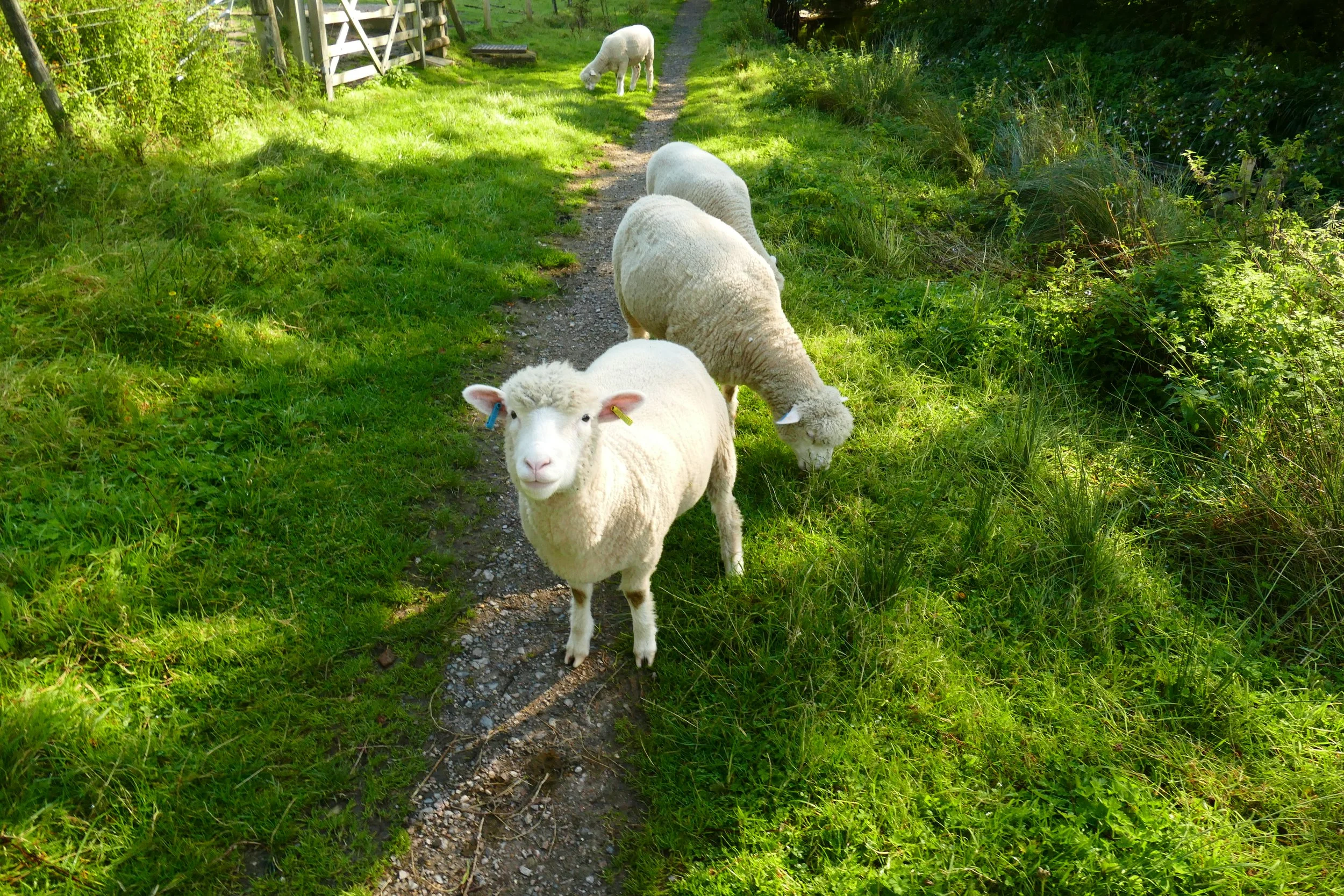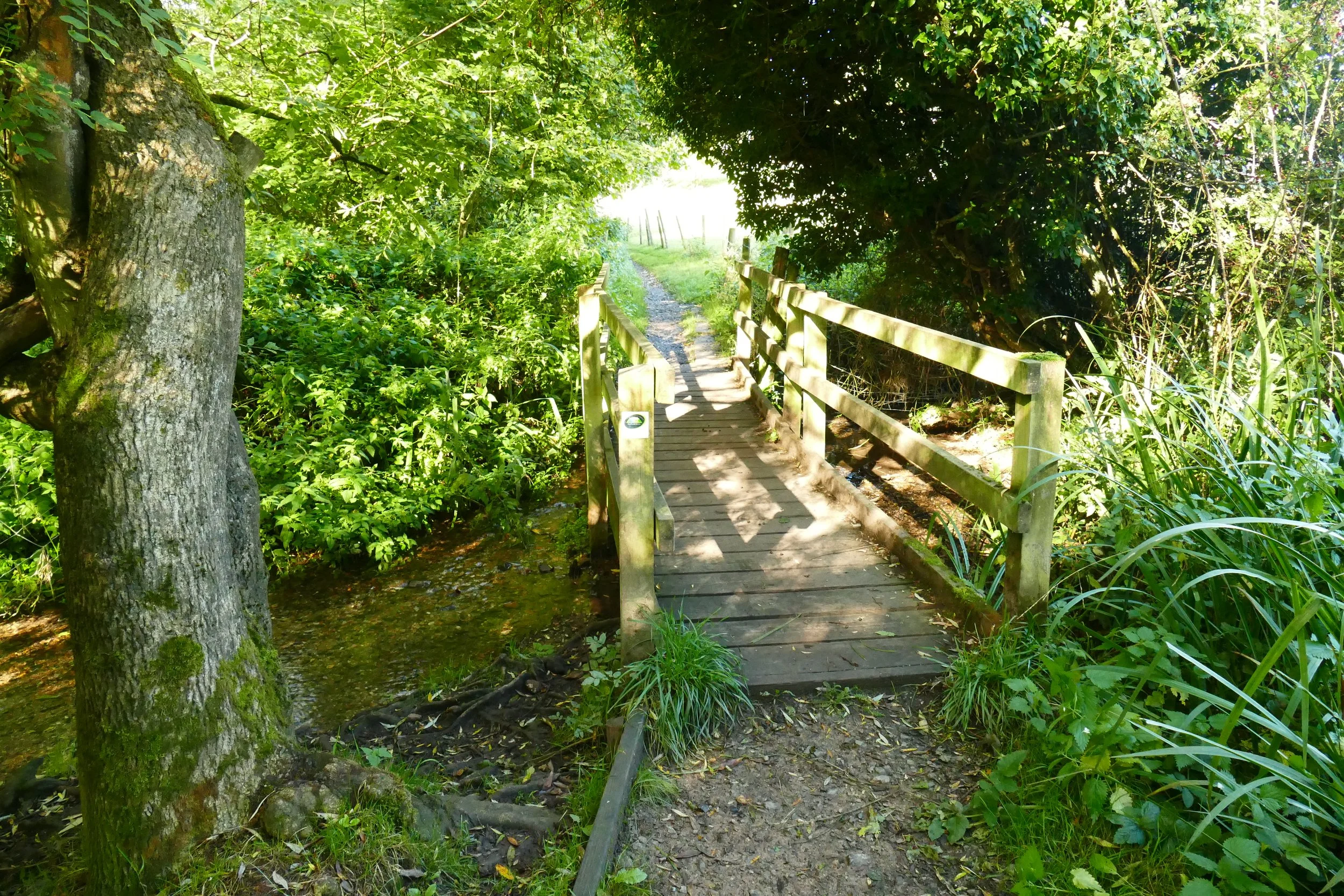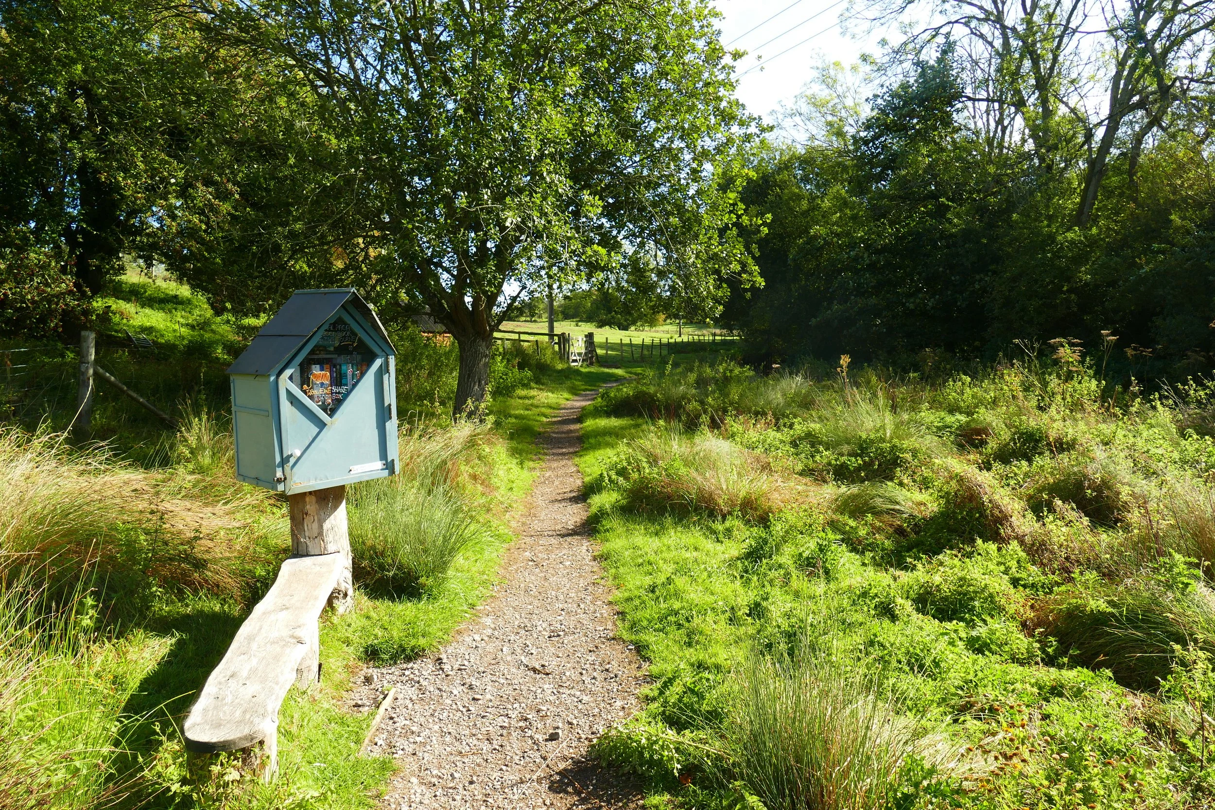 As you walk along this path look out for some farm animals in the paddocks on your right including sheep, alpacas, donkeys and pigs. Go through the next kissing gate and then cross over a little stream. When we last walked the next stretch of path there were some very tame and friendly sheep grazing. You should also look out for a little second-hand book swap box and a bench from which to enjoy your book by the stream.
