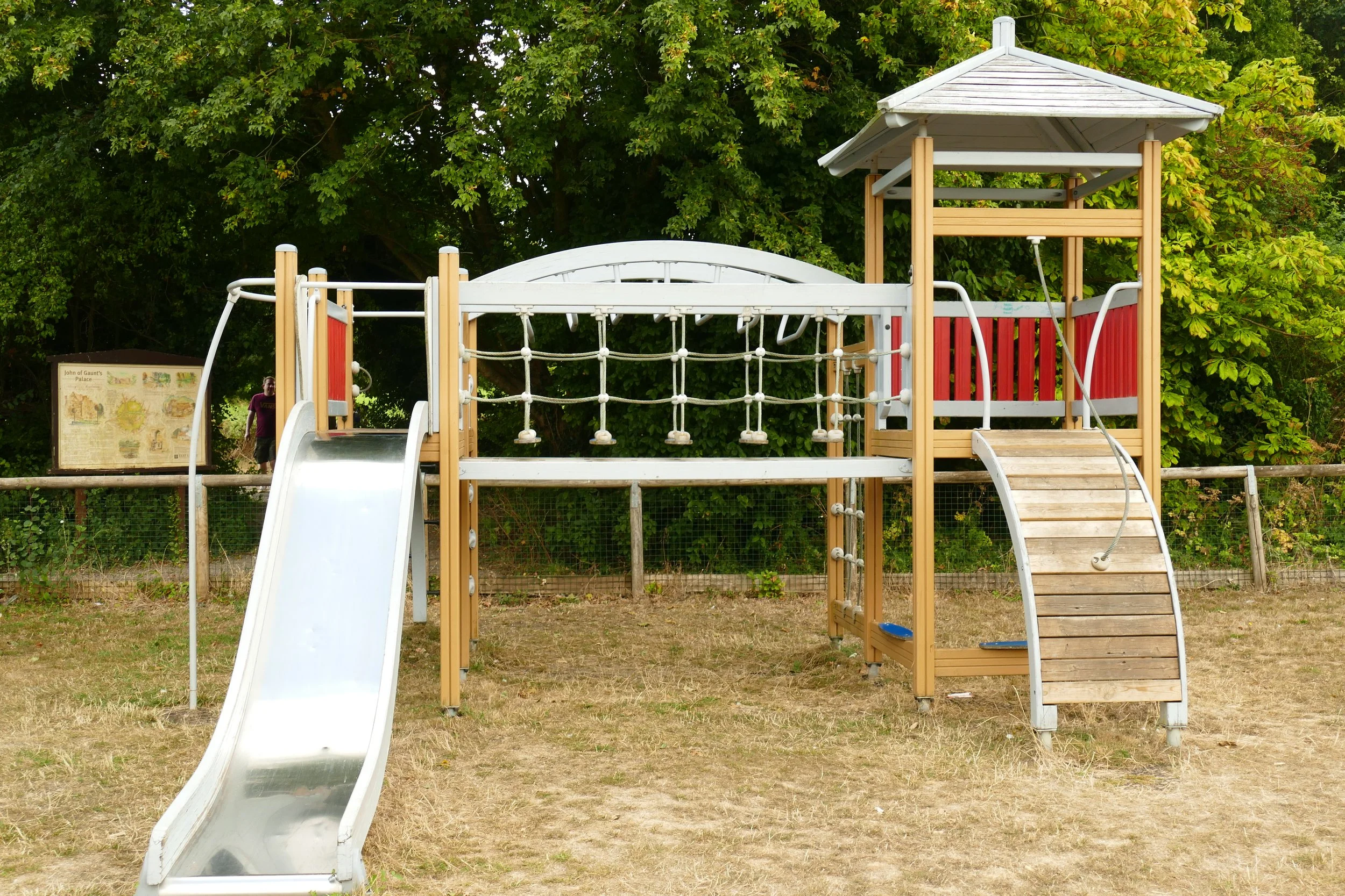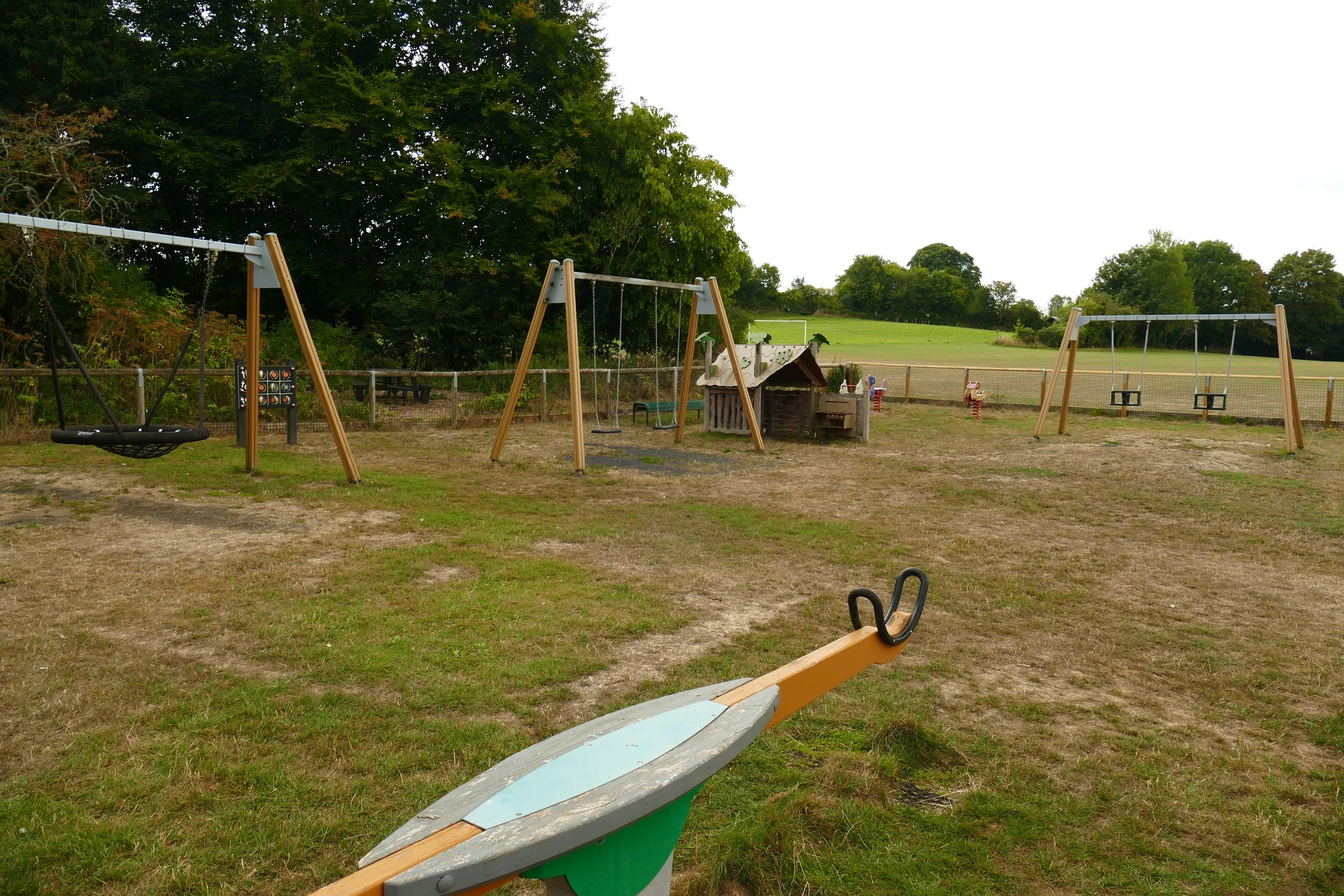 Cross the road and immediately join the footpath going up the bank opposite. Walk tightly between a wooden fence and a green wire fence and keep forward (ignoring right turns) until you reach a residential road. Turn right, and after a few metres, take the footpath just to the left of Greenacres. You will then enter the recreation ground. If you walk straight ahead, you will find the play equipment beside a nursery school.