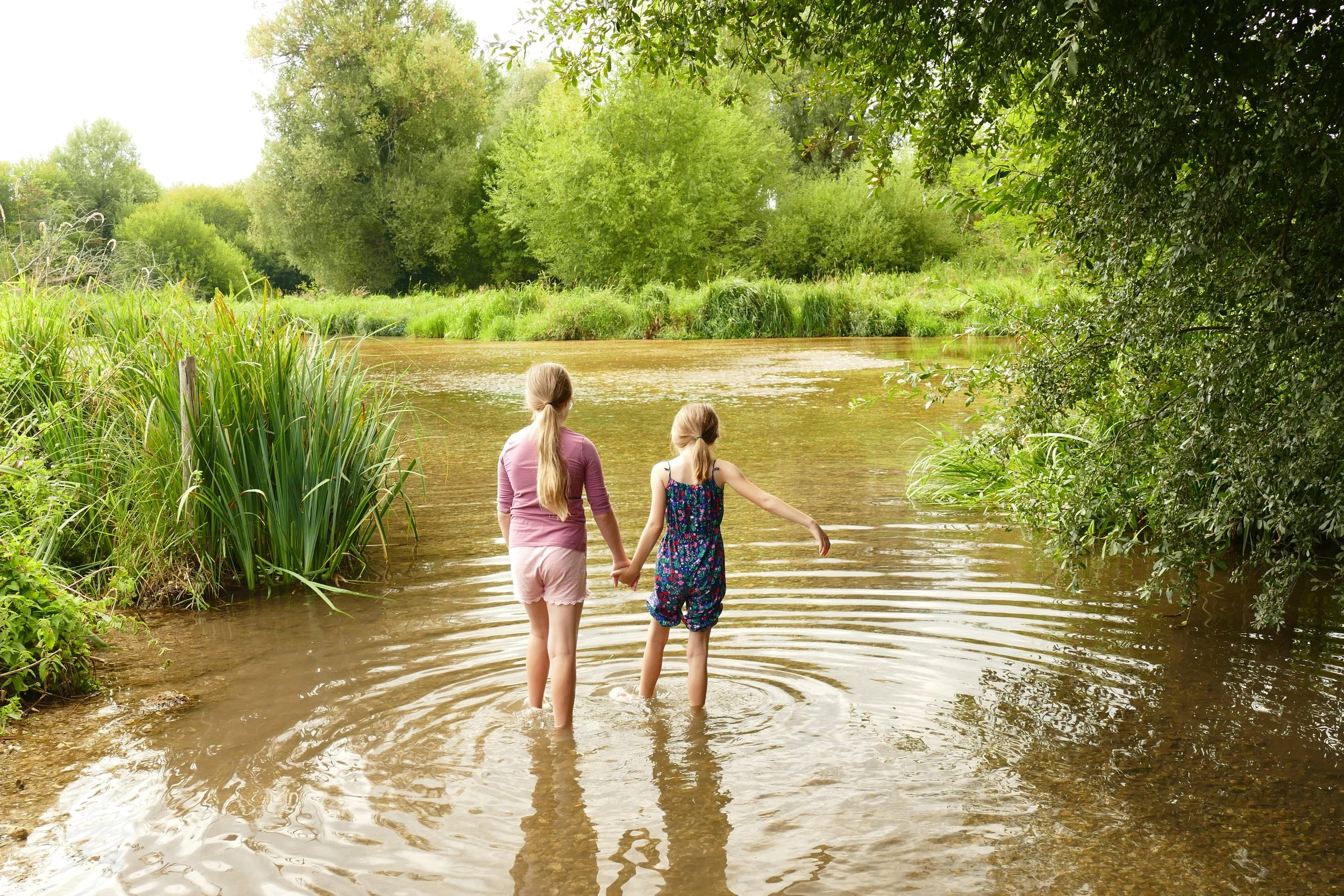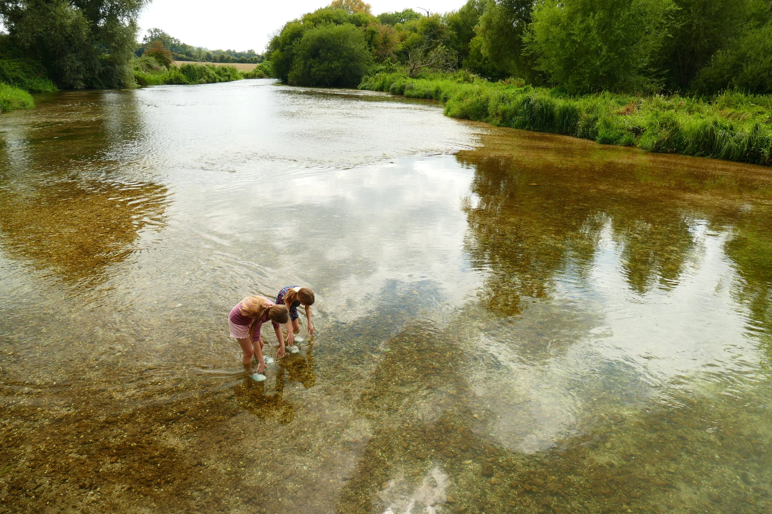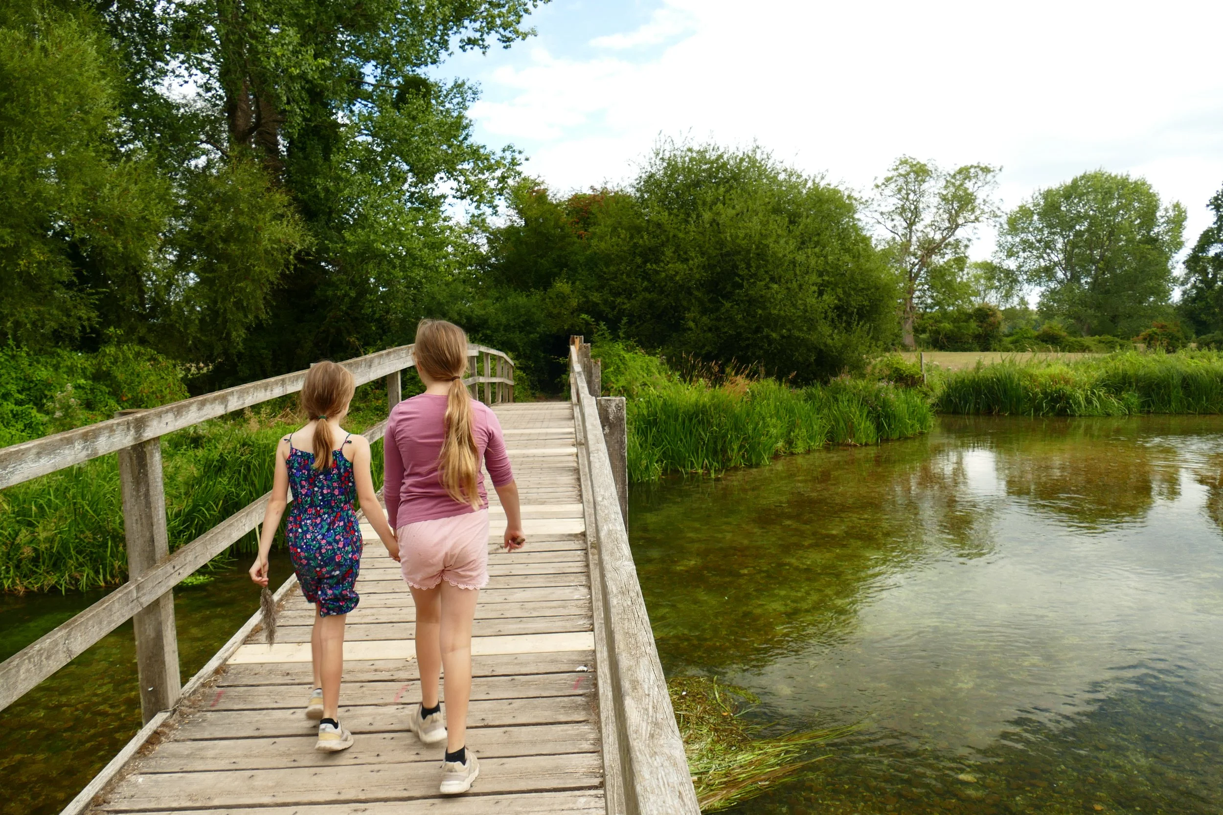 At the cross paths at the bottom, we suggest going straight across to make a there and back diversion towards Houghton. We recommend this because the path crosses the streams of the River Test twice before reaching a third bridge and a wide, shallow ford where children can paddle, and there is even a deep enough part for a wild swim. There is a small access point before the bridge. Please do not try to enter the water anywhere else and note there are no benches or grass for picnicking on. Return to the cross paths after the ford.