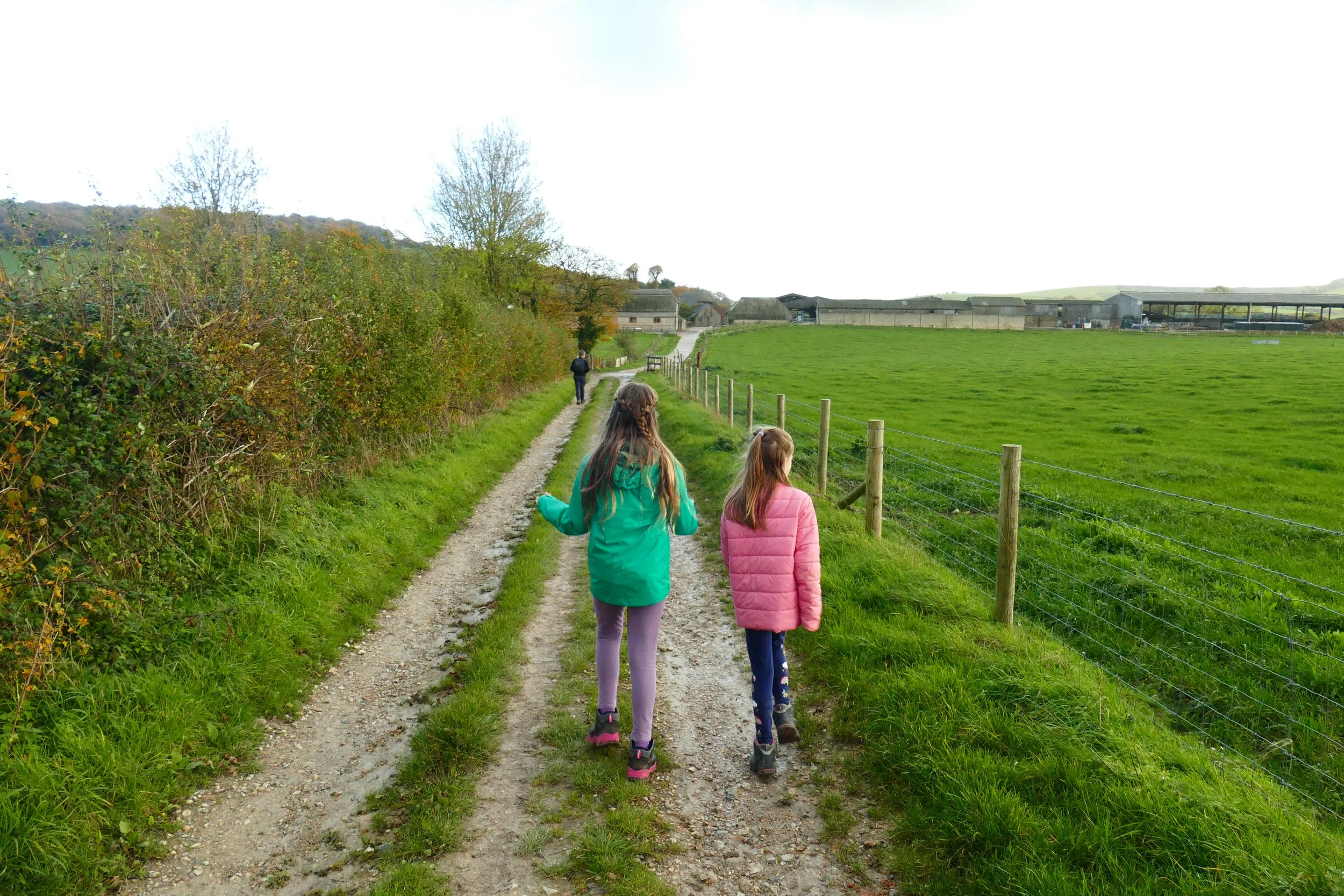 2. The path veers off to the right and makes its way down the field. As you near the bottom of the hill, you will negotiate a series of farm gates that are usually propped open. Bend left with The South Downs Way and then follow the straight farm track to Whitewool Farm.