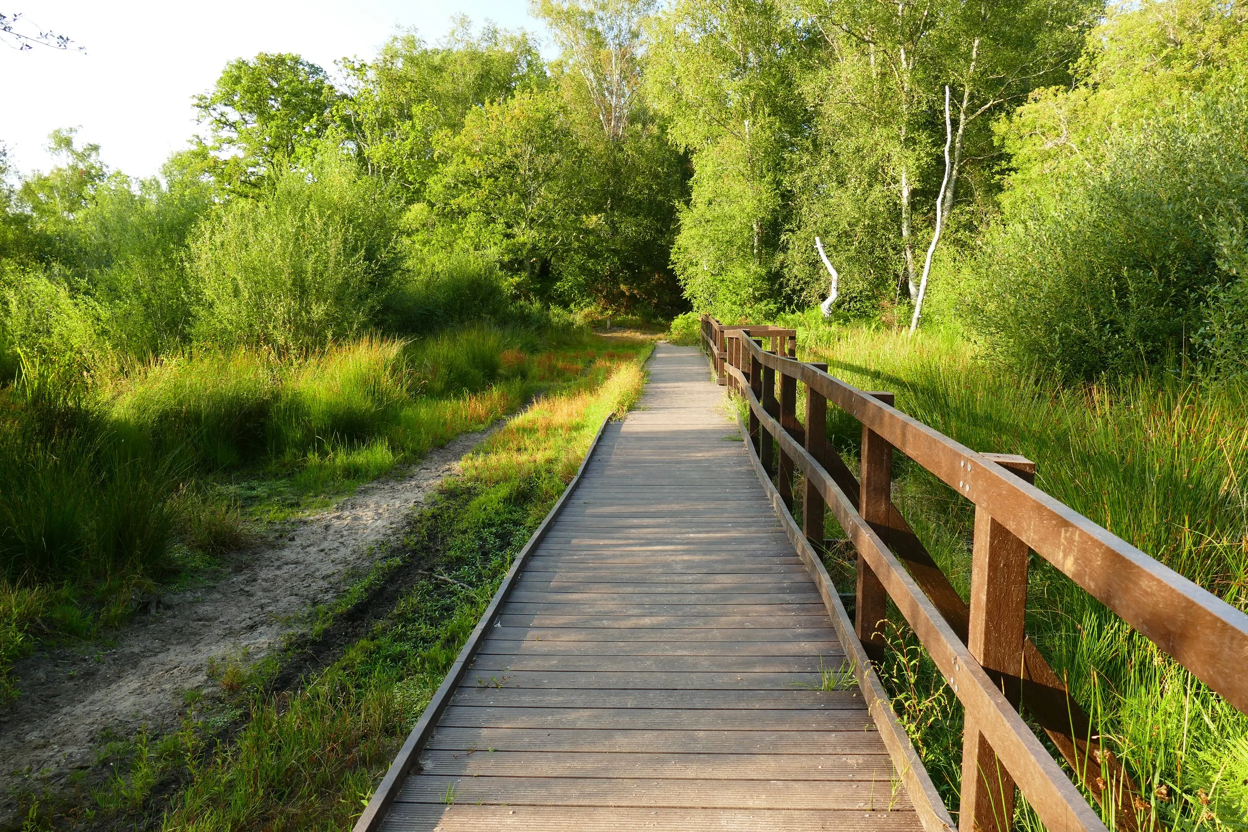 Standing in the car park, facing the pond with the road behind you, begin the walk on the boardwalk to your left marked by a little post with a paw print on. This will bring you around the short side of the pond with the water to your right. When you reach some concrete bollards, turn left and walk along the sandy path heading away from the pond.
