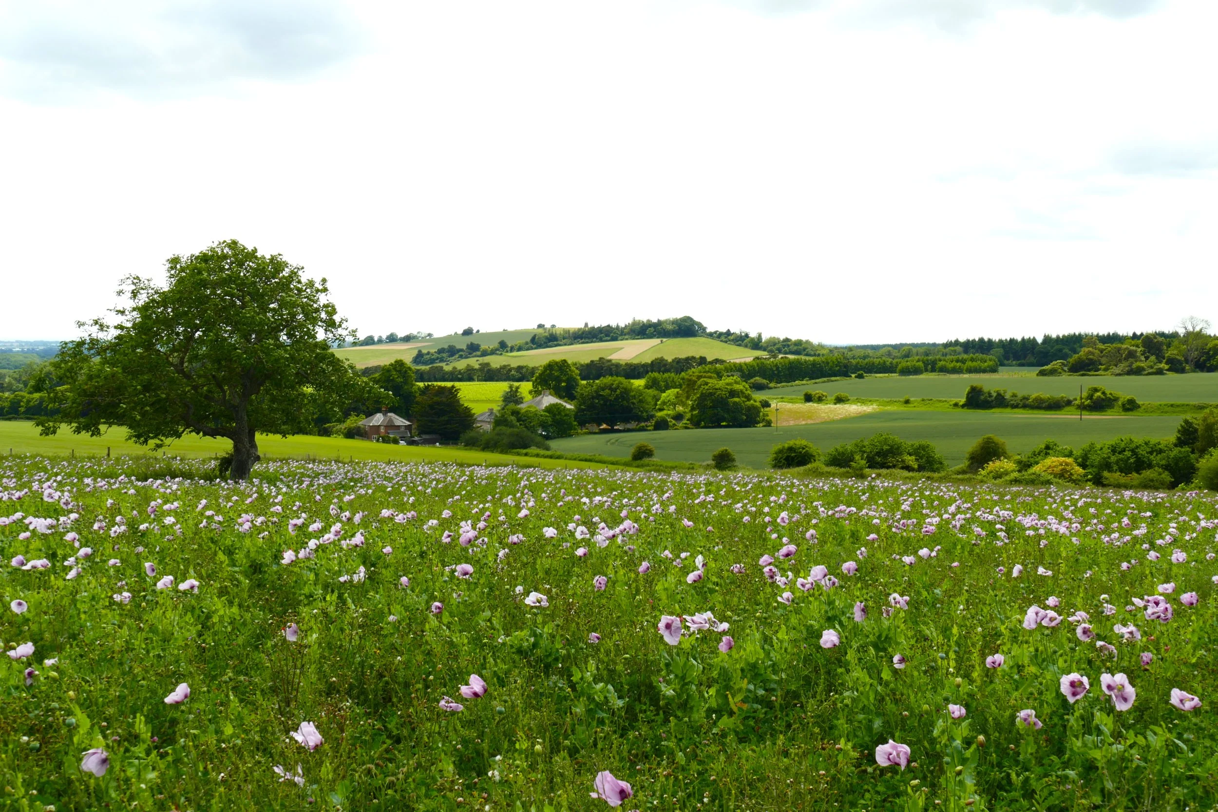 Keep left when you meet The Monarch’s Way and continue through the trees until the path opens up into a field. The open space will stretch up to your left. Keep going straight ahead and when the hedge/tree line to your right ends, you should see the patch of pink poppies ahead of you with the views beyond. The path goes straight through the middle of the poppies.