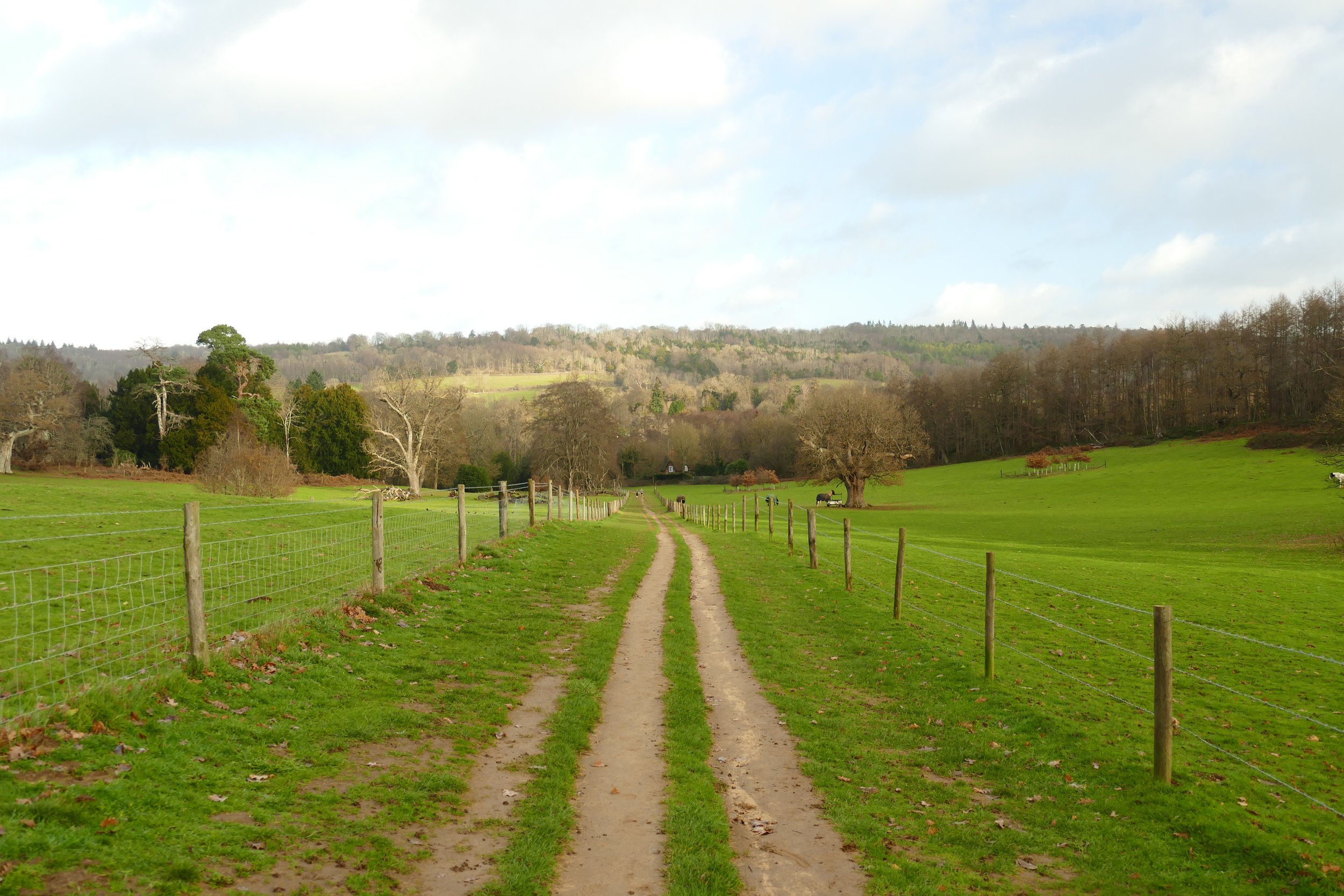 Go straight on when you hit the tarmac of The Spinning Walk and then cross the busier Shere Lane at the bottom. Veer slightly to your left on the other side and walk up Pathfields. Continue up the hill, passing the houses until you come to an obvious footpath straight ahead of you going narrowly between fences.