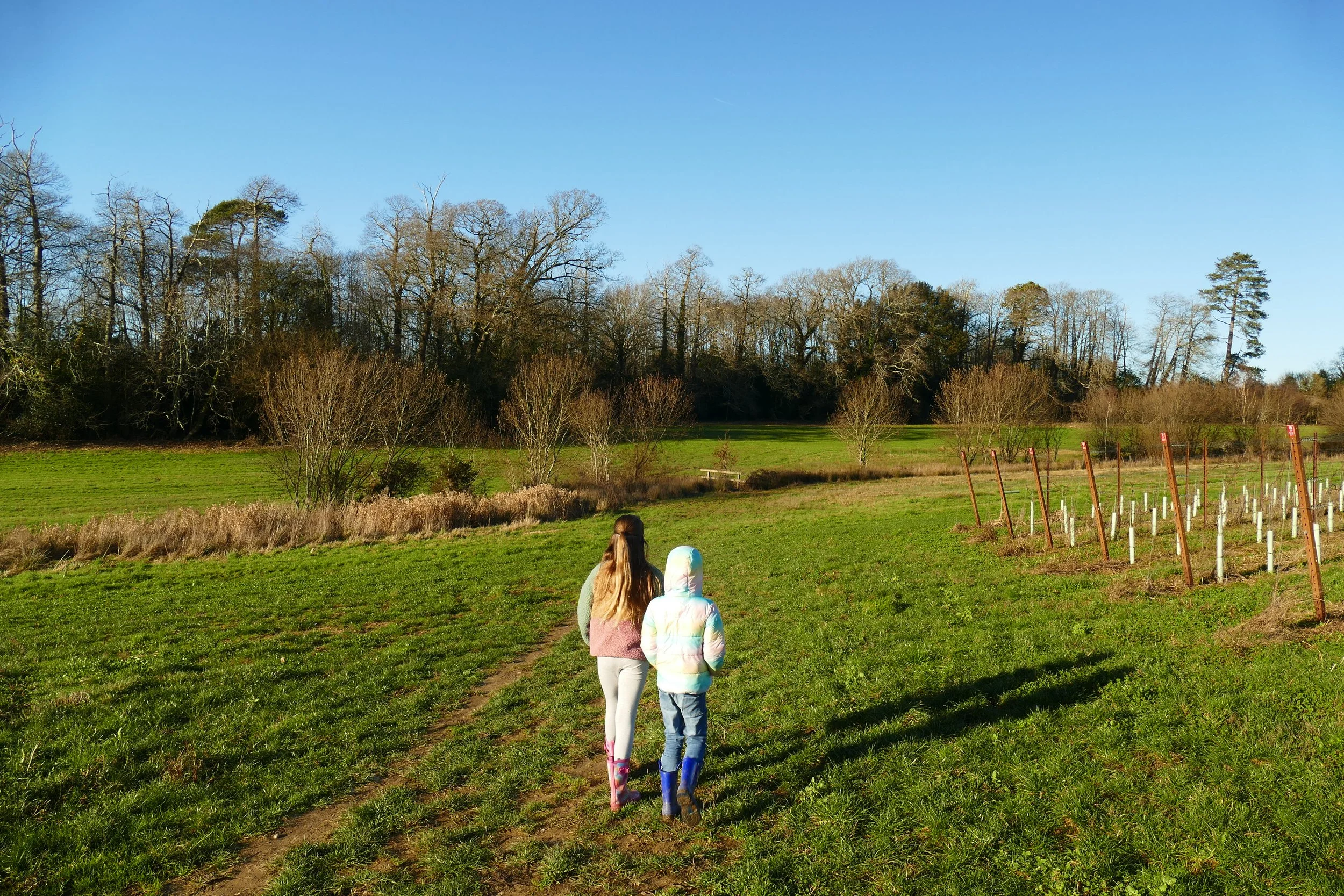 Proceed down Back Lane for a short way until you spot the cottage with a flag pole and the start of a footpath on your right. The path will go over a little footbridge before climbing through a Christmas tree plantation. At the top of the field, cross into the next much larger field planted with grape vines and follow the path to the opposite hedge.