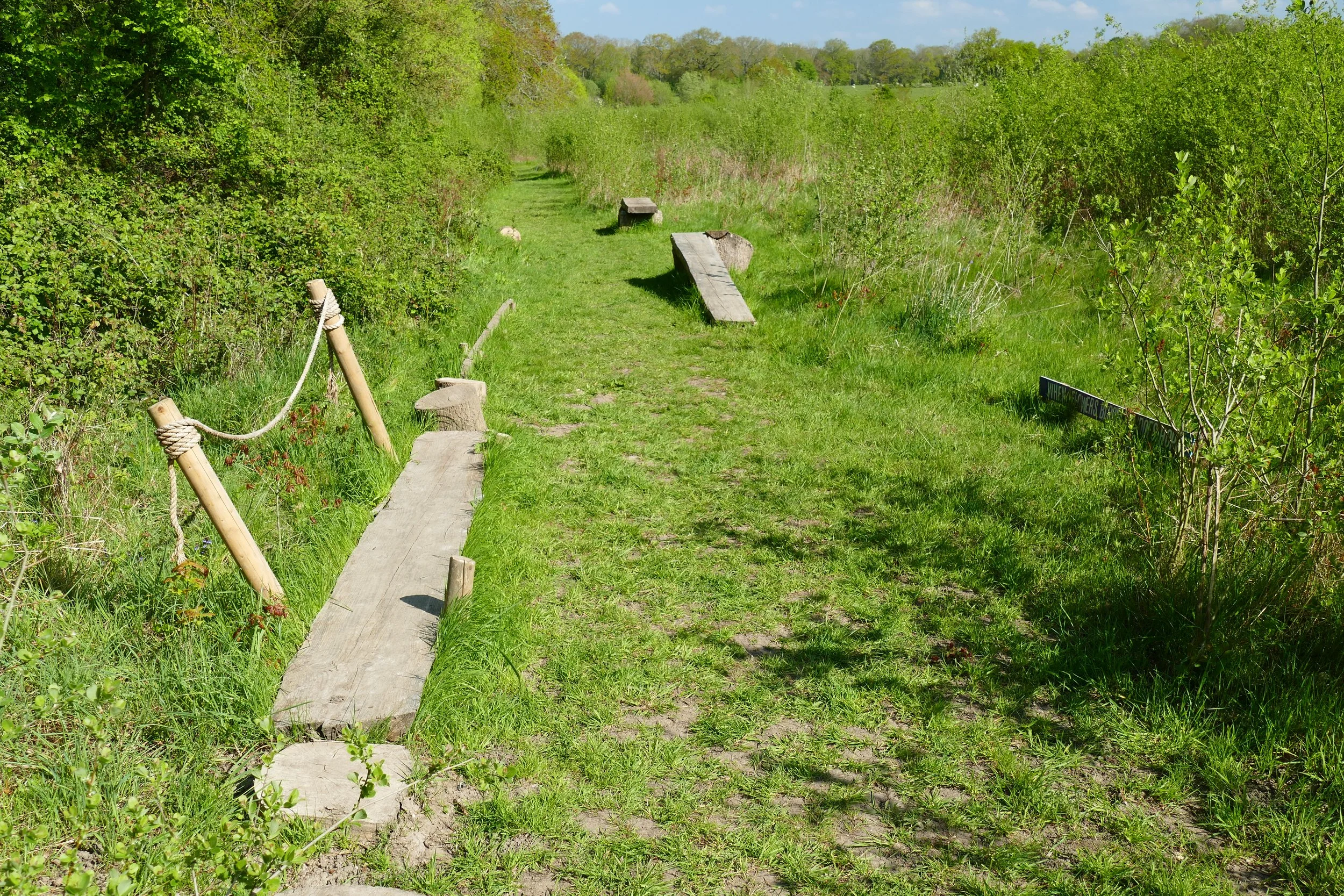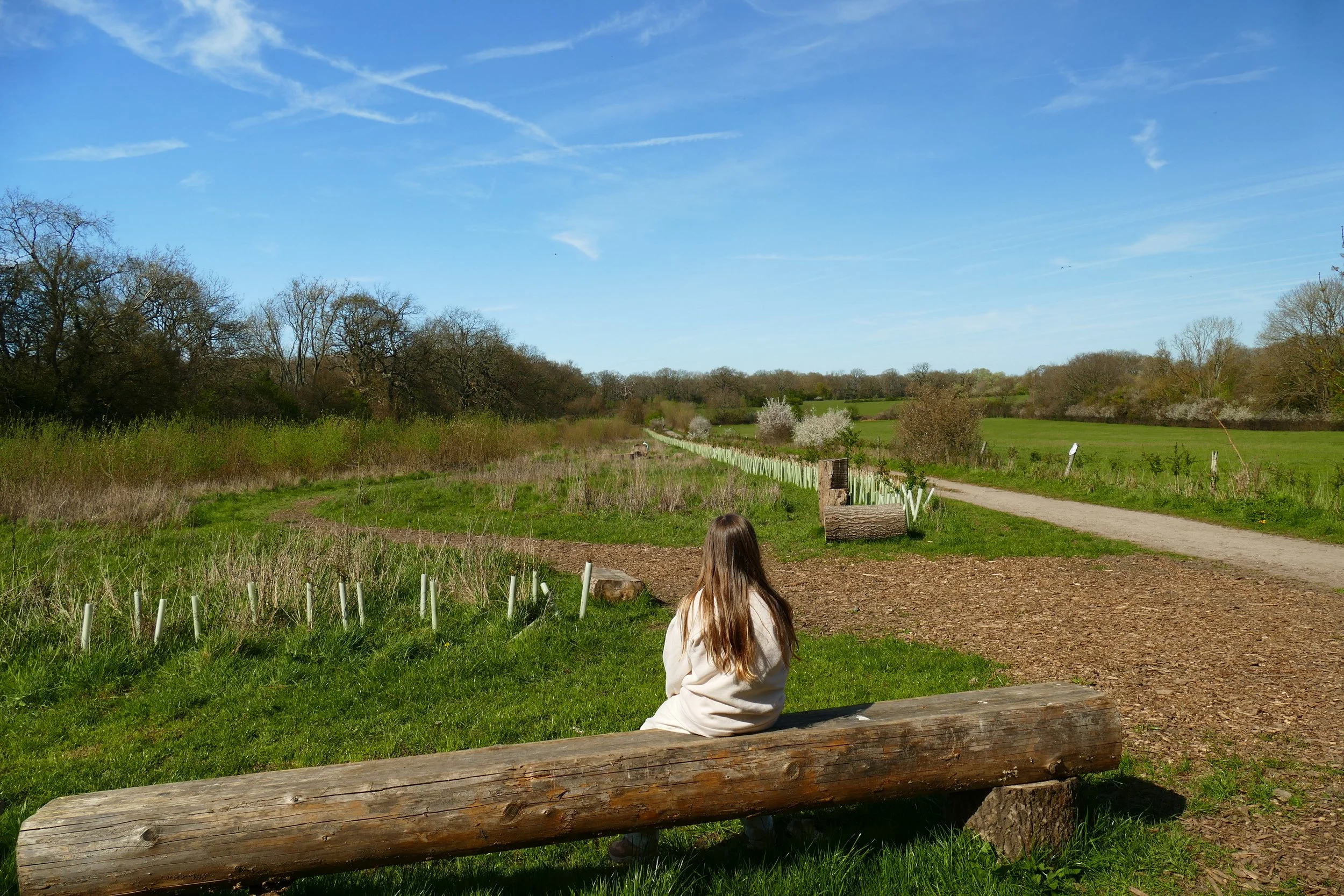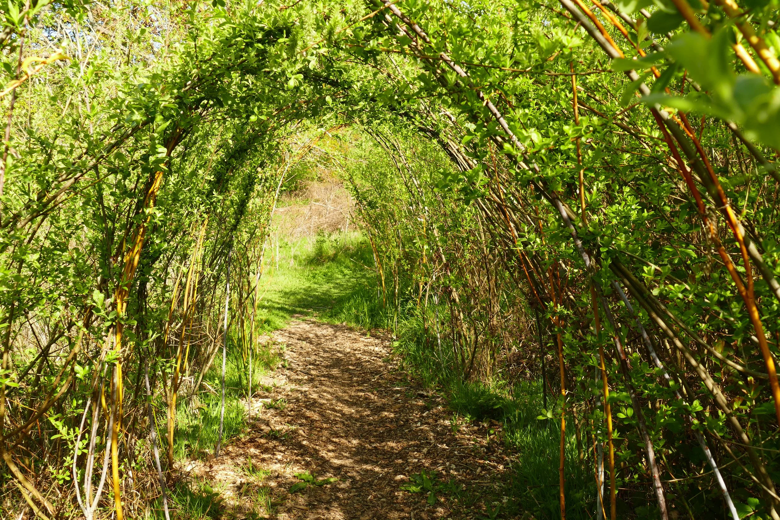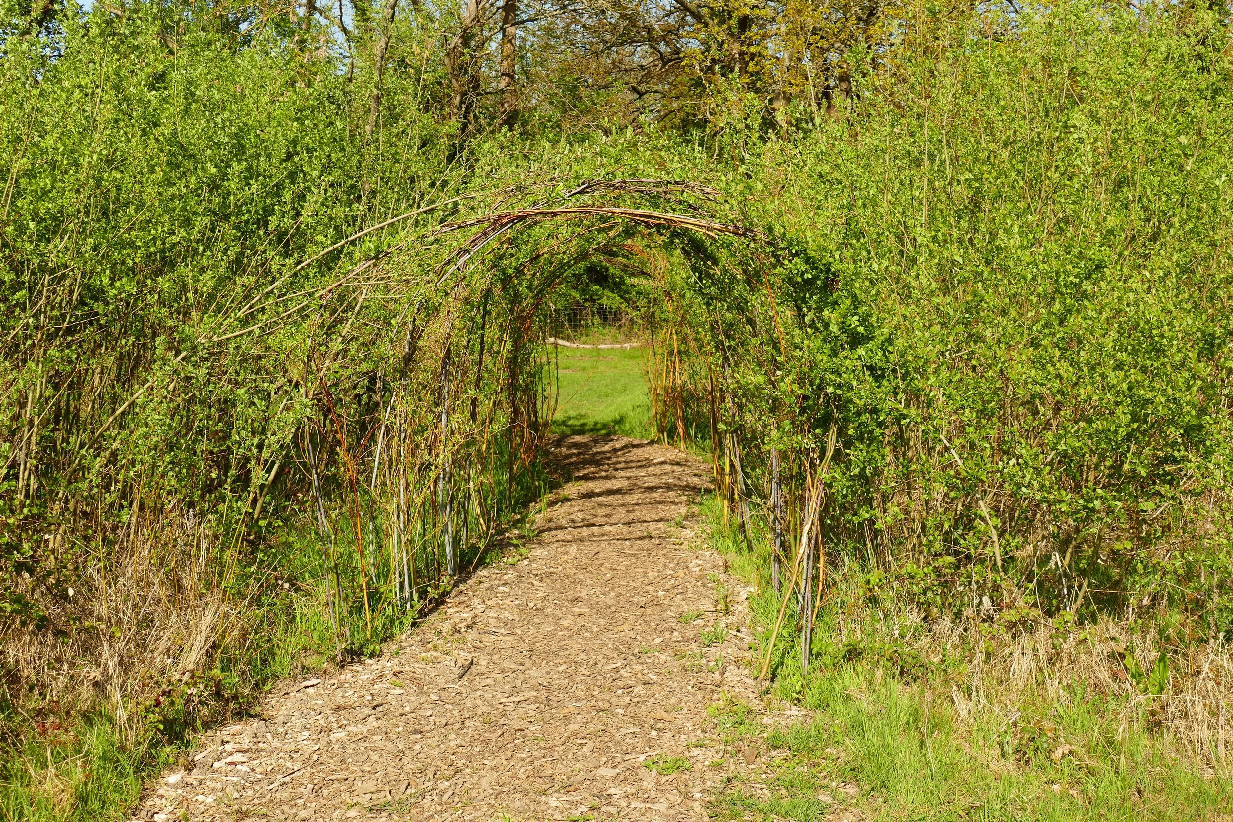 This walk is a rectangle shape with four turns, making it nice and easy to follow. Begin from the car park by the information board and walk up between the two black barns. Turn left along the wide gravel track, passing a wooden noticeboard to your right. This path will take you in a straight line to the start of the Willow Walk. A circular sign will show children where to start. They will find a mud kitchen, den making area, balance beams, a sky lounge, stone library, willow tunnels and log seating all within a small area. Once the kids have had their fun, continue the walk along the wide, chunky gravel track to the right of the Willow Walk. This straight path will take you along the edge of Lollesworth Wood, where you will see bluebells in spring.