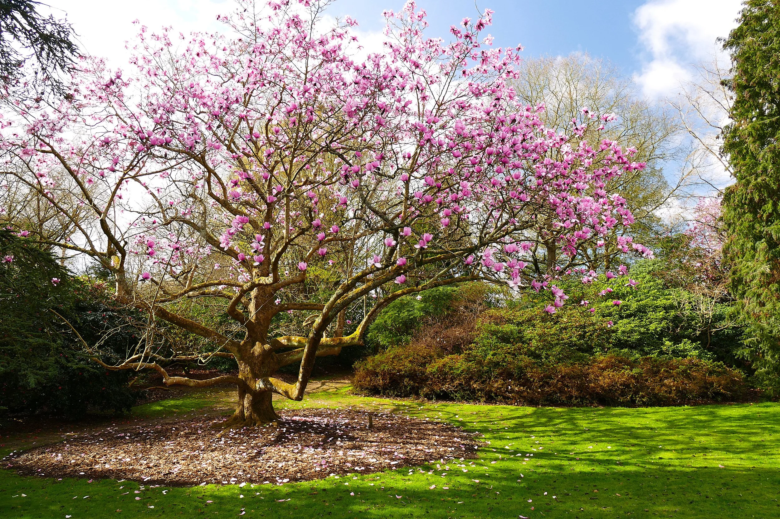 Just before the water, turn right where there are two large bins inside a wooden casing and walk with Virginia Water behind the bushes to your left. As you walk along this path, you will enter Valley Gardens and dogs should go on leads. Look out for a little path on your left where you can make a brief diversion to Botany Bay Point where there is a seating area and views over the lake to the Leptis Magna Ruins. Back on the path, continue straight and look out for the camellia gardens and The Punchbowl, which are worth little diversions to explore when the plants are in flower.