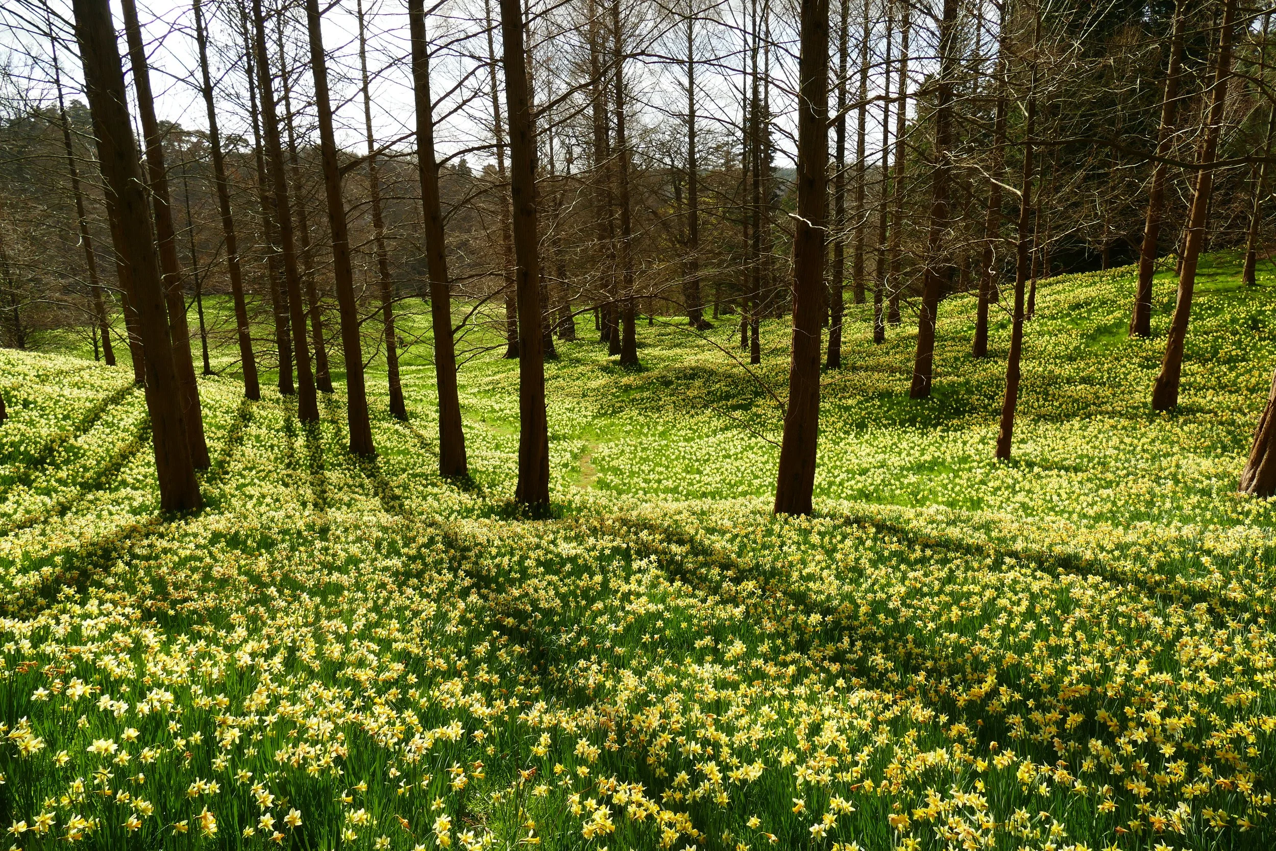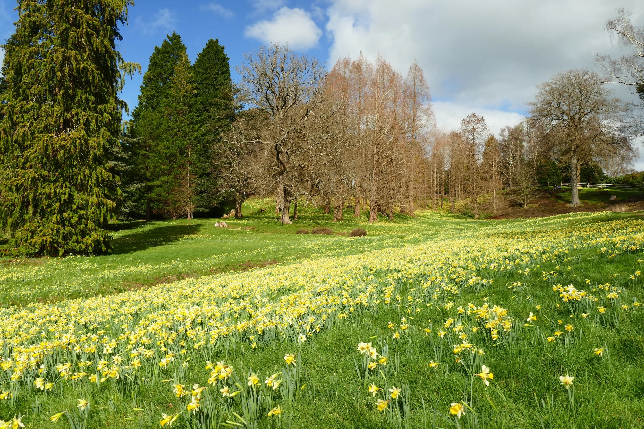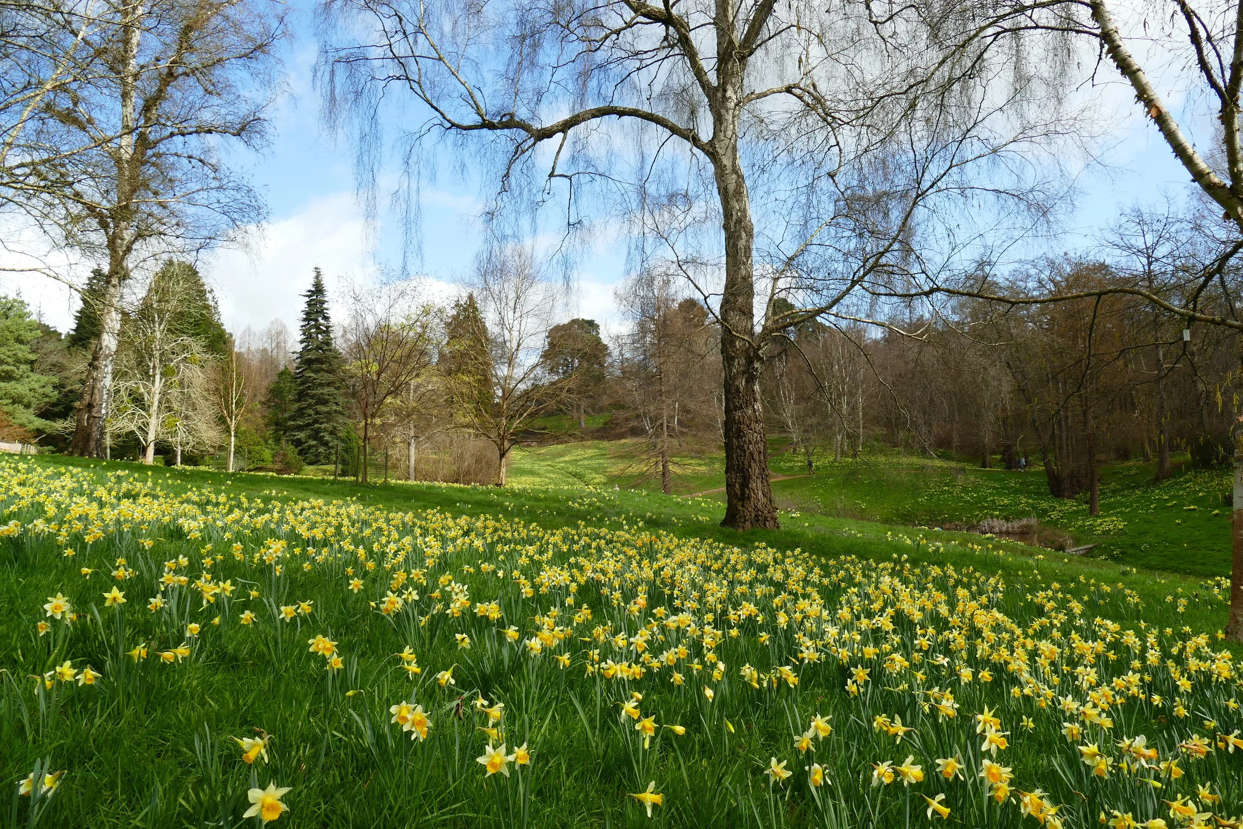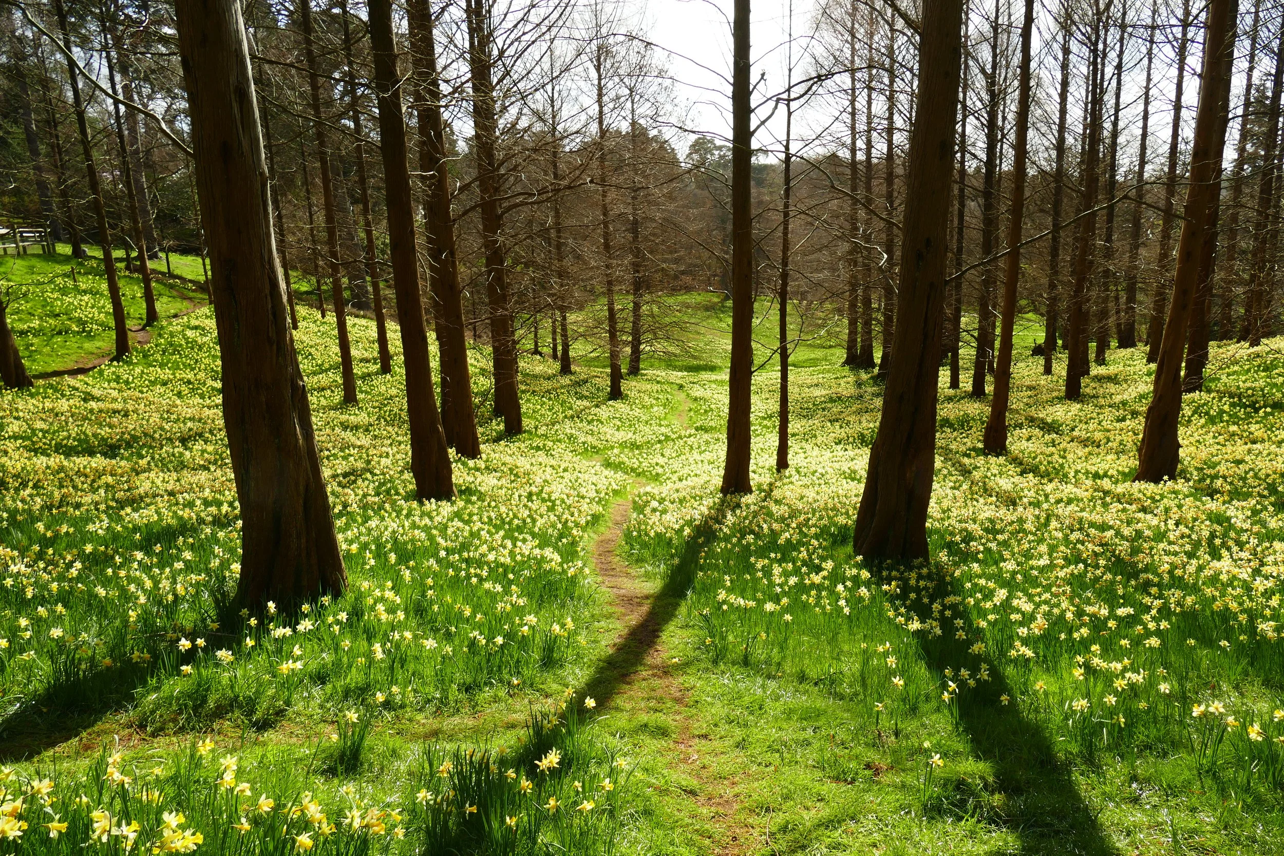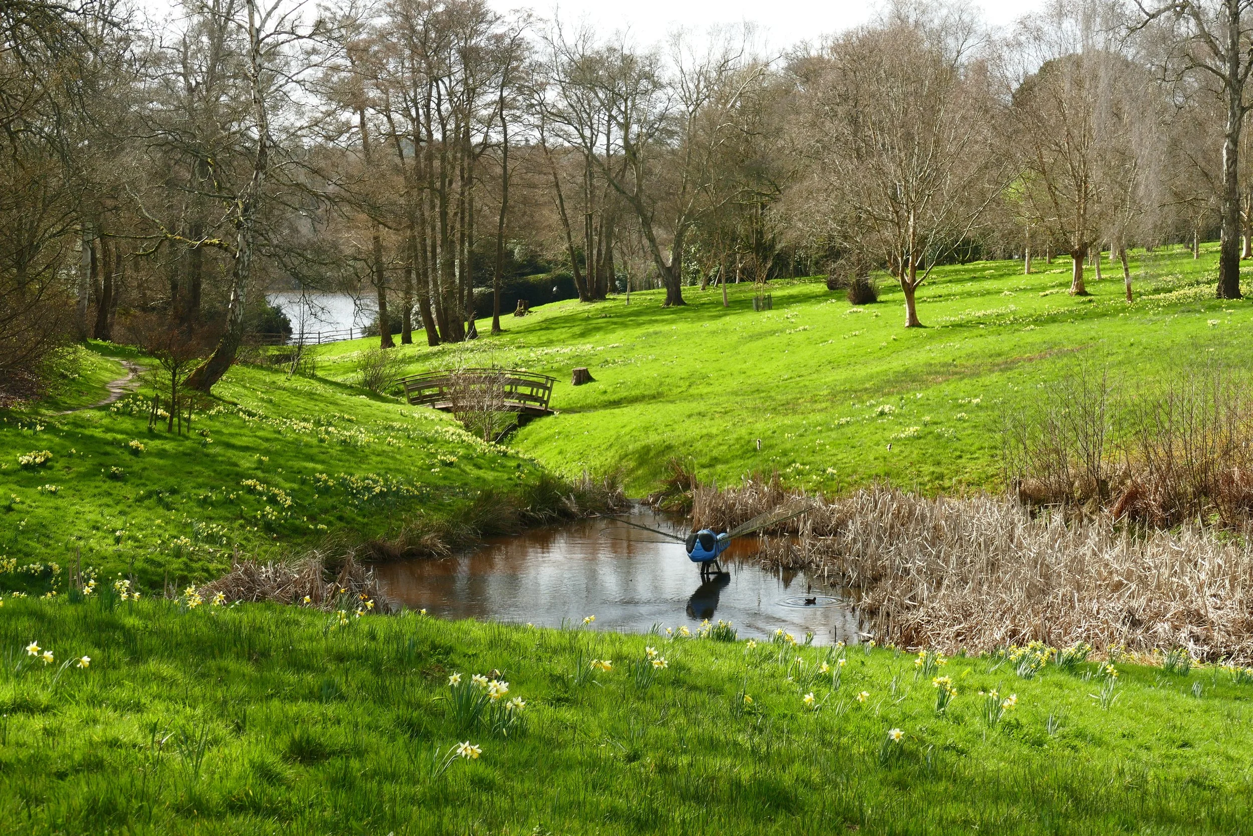 Walk down the lawn and cross over the little humpback bridge next to a giant blue dragonfly. Go up the steps on the other side and then turn right when you reach the compacted gravel path. The wooded valleys to your left are covered in daffodils in March. Continue along the path as it bears left and climbs up hill.